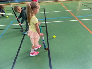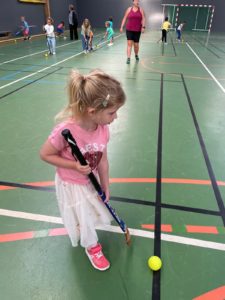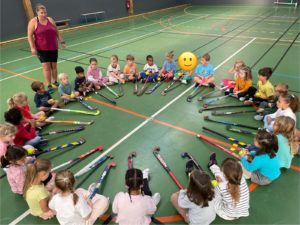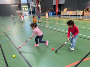 Et c’est parti pour une initiation au hockey ! Tous les élèves de la GS au CM2 en bénéficieront au cours de l’année grâce à l’intervention de Coralie.