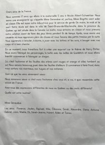 Au retour des vacances de la Toussaint, nous avons eu le plaisir de trouver une lettre provenant du Canada. Elle est venue en avion de Saint-Bruno de Montarville près de Montréal.